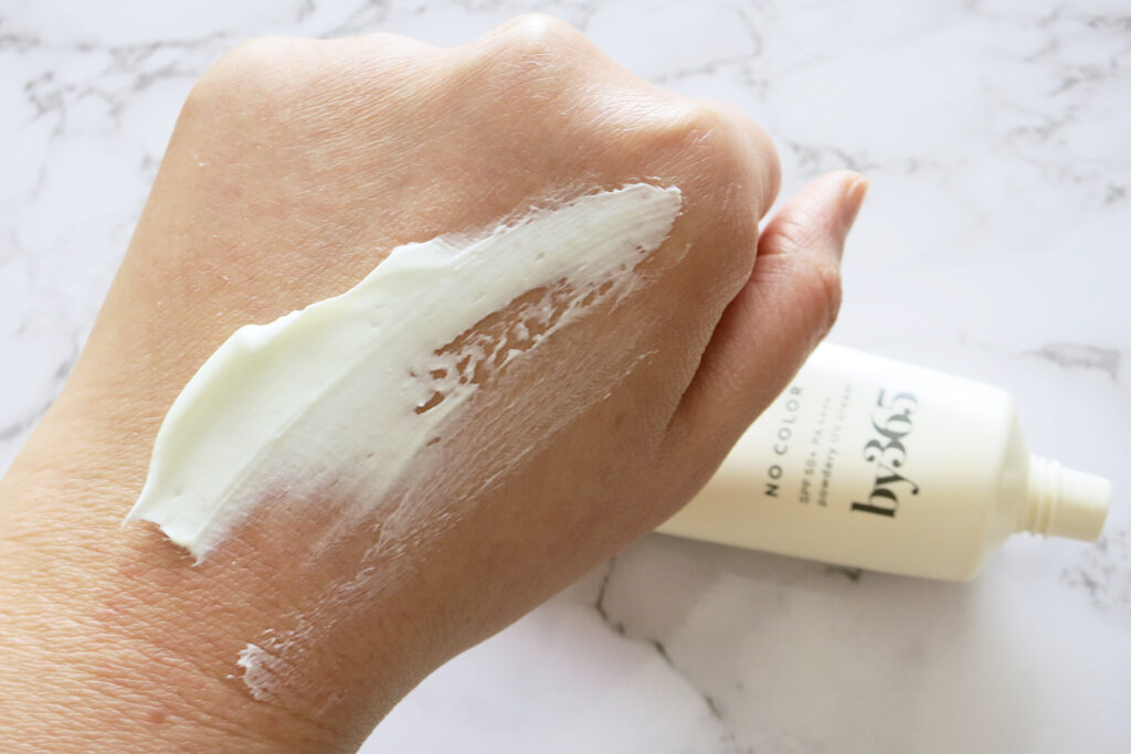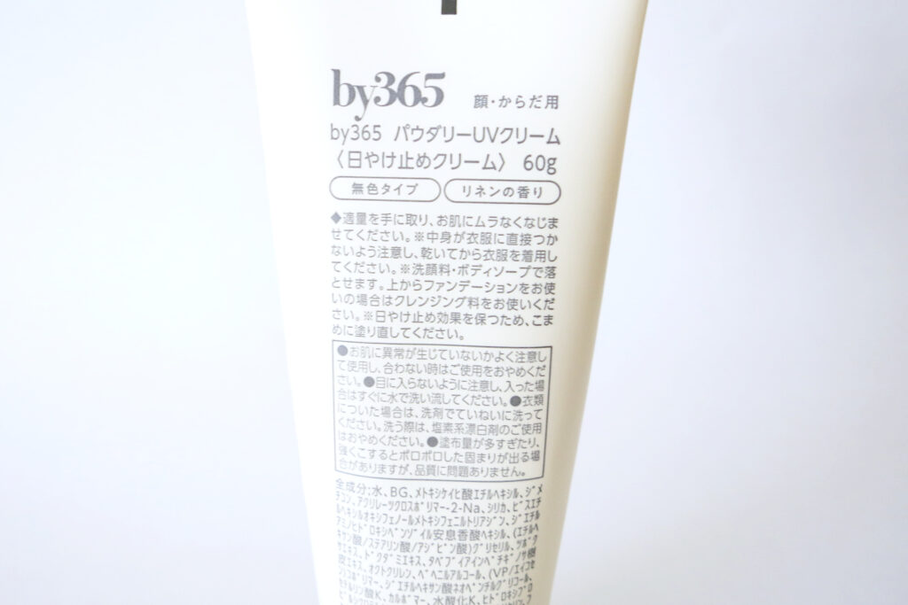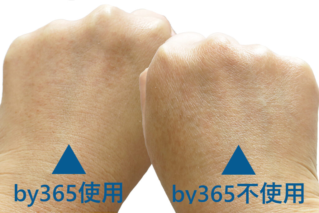 ↑は左側の手だけにby365を使用した比較画像です。CICAなどのうるおい成分とパウダーのおかげで、肌がなめらかに見えませんか?